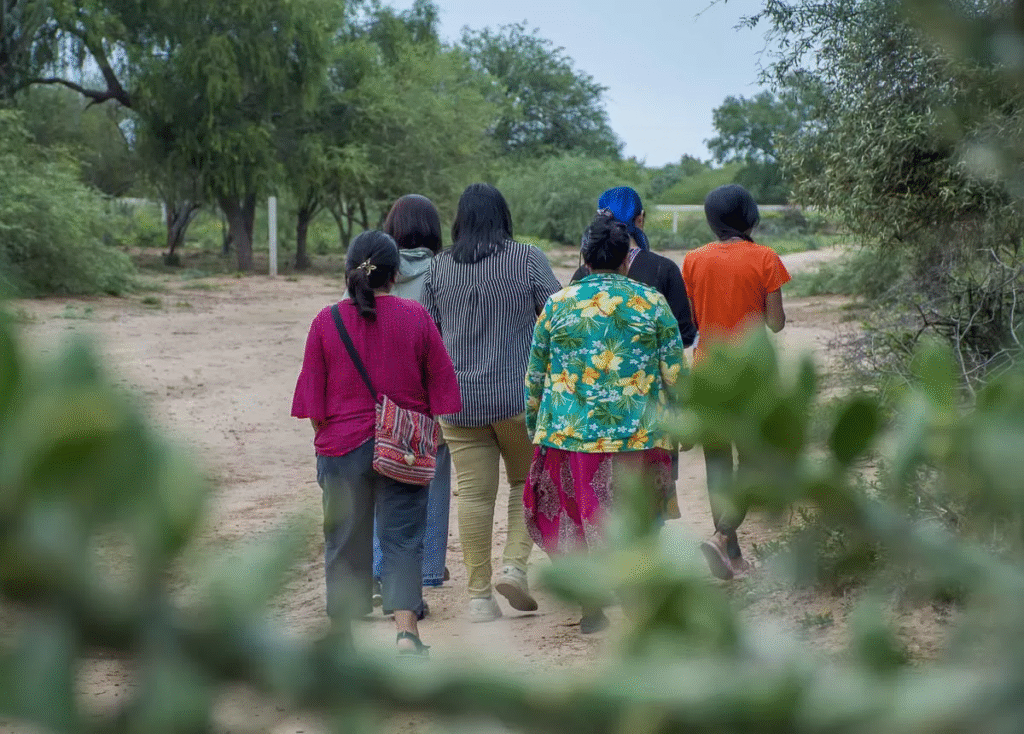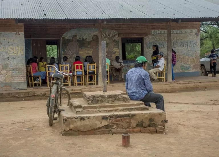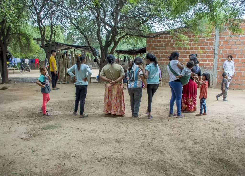 A más de 140 quilómetros de Tartagal, lideresas wichís recorren La Cortada, otra de las comunidades emplazadas al margen de la ruta 81, invitando a participar del taller que comenzará en una hora en un centro comunitario que les presta el salón.