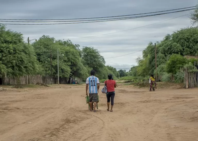 Despojados de sus tierras, los wichís –uno de los 14 pueblos originarios de Salta– sobreviven a la sombra del pueblo criollo. De un lado de la carretera, cercados por enrejillados con restos de maderas, están sus ranchos de techos de chapa sostenidos por horcones de palo santo y paredes construidas con retazos de plástico y ramas. Del otro, las casas de cemento y bloques de las familias criollas; población que se define como blanca y descendiente de europeos.