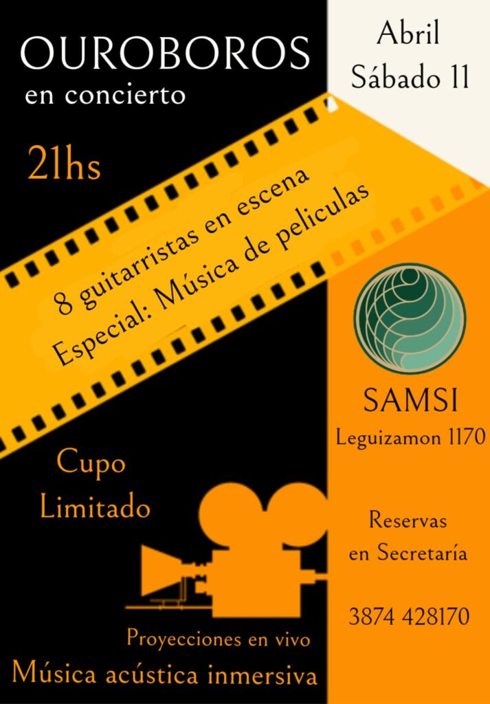 El próximo sábado 11 de abril a las 21 horas, el Círculo de Guitarras Ouroboros ofrecerá un espectáculo especial en el Centro Samsi, donde la música y el cine se fusionarán en una propuesta artística inmersiva.
