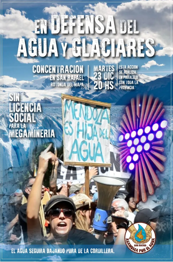 Integrantes de esta agrupación realizaron la convocatoria para una concentración este martes, desde las 20 horas, en la ciudad de San Rafael, en defensa del agua y la Ley de Glaciares. Llaman a concentrar a todos aquellos que quieran participar de “la defensa del agua y los glaciares”.